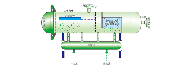 在一定的壓力作用下,氣體進(jìn)入過濾器,較大固體的顆粒一般呈直線運(yùn)動,較小的顆粒則會做自由運(yùn)動,濾芯采用篩、擋、阻三種方式去捕捉這些微粒,由于濾芯材料分子吸引作用吸引液體,并聚結(jié)成較大的液滴,通過將液滴吸引到纖維上,濾芯逐漸變濕,濾芯纖維間越來越多的空格被液體和固體顆粒塞滿,進(jìn)入分離腔的液滴,由捕霧器捕捉而脫離氣體。